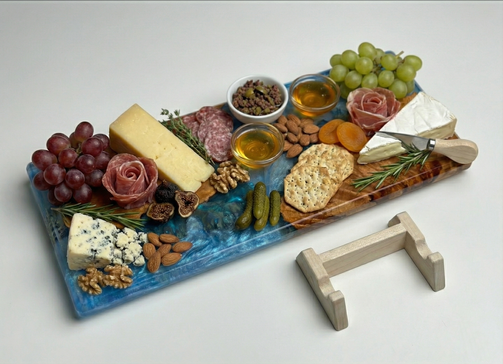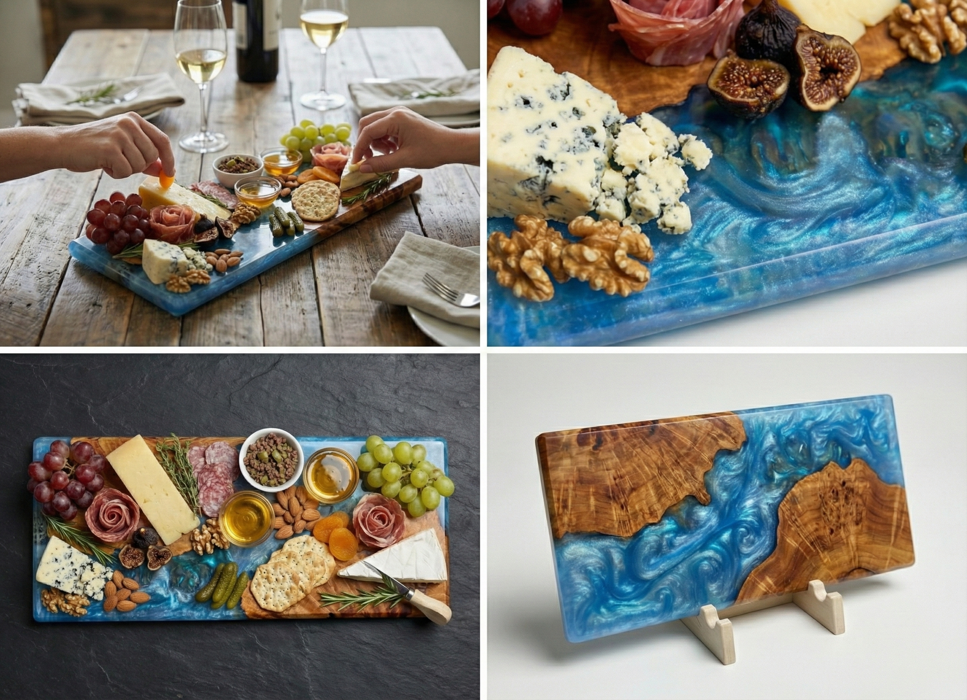 - Materials: Sustainable Burled Wood (Live Edge) & Food-Safe Blue Epoxy Resin.