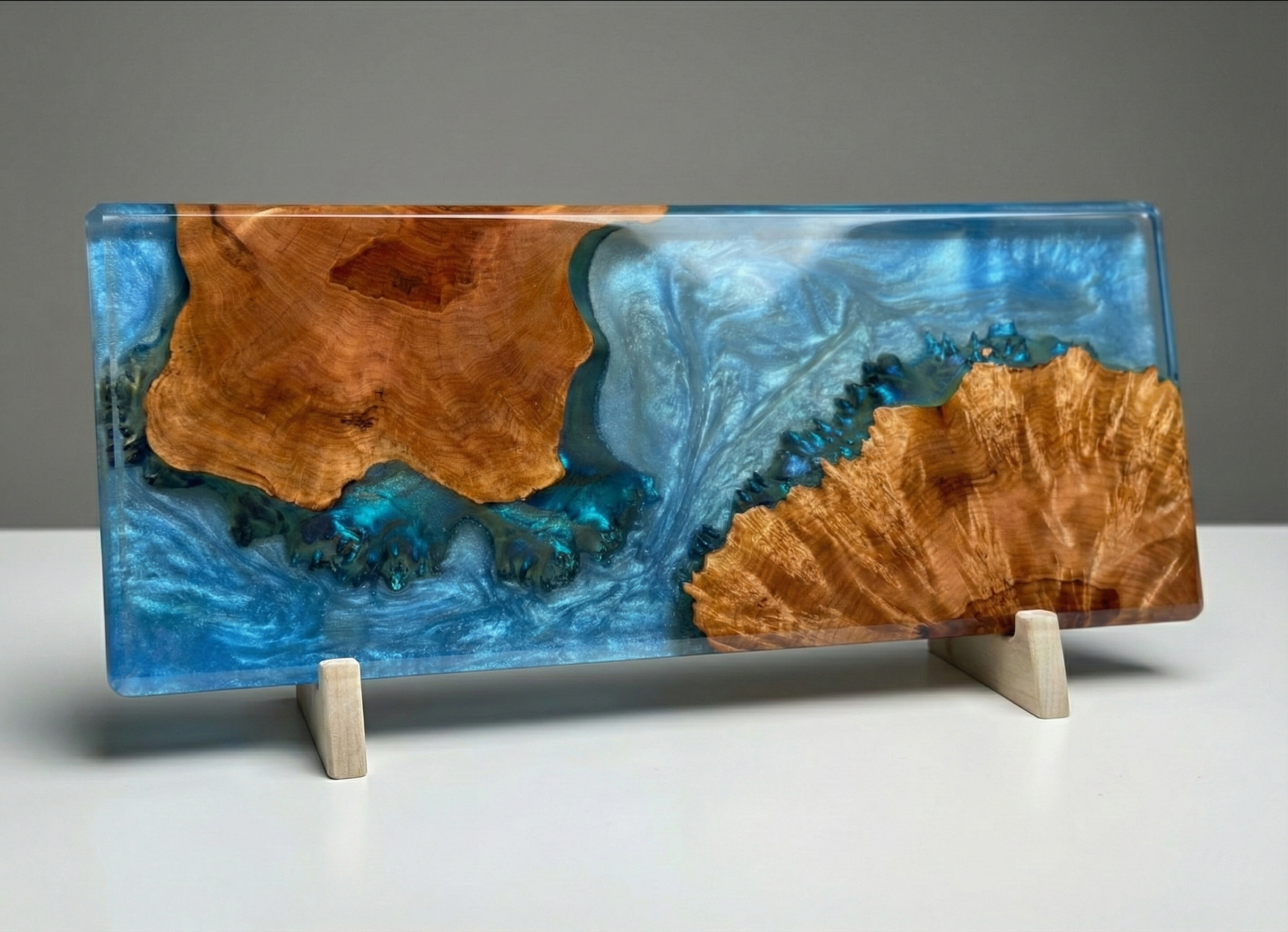 Handcrafted from highly figured burled wood, the organic "shoreline" of the timber contrasts beautifully with a deep, river-pour of pearlescent blue epoxy resin. The resin is swirled with metallic pigments that catch the light, mimicking the depth and movement of tropical waters.