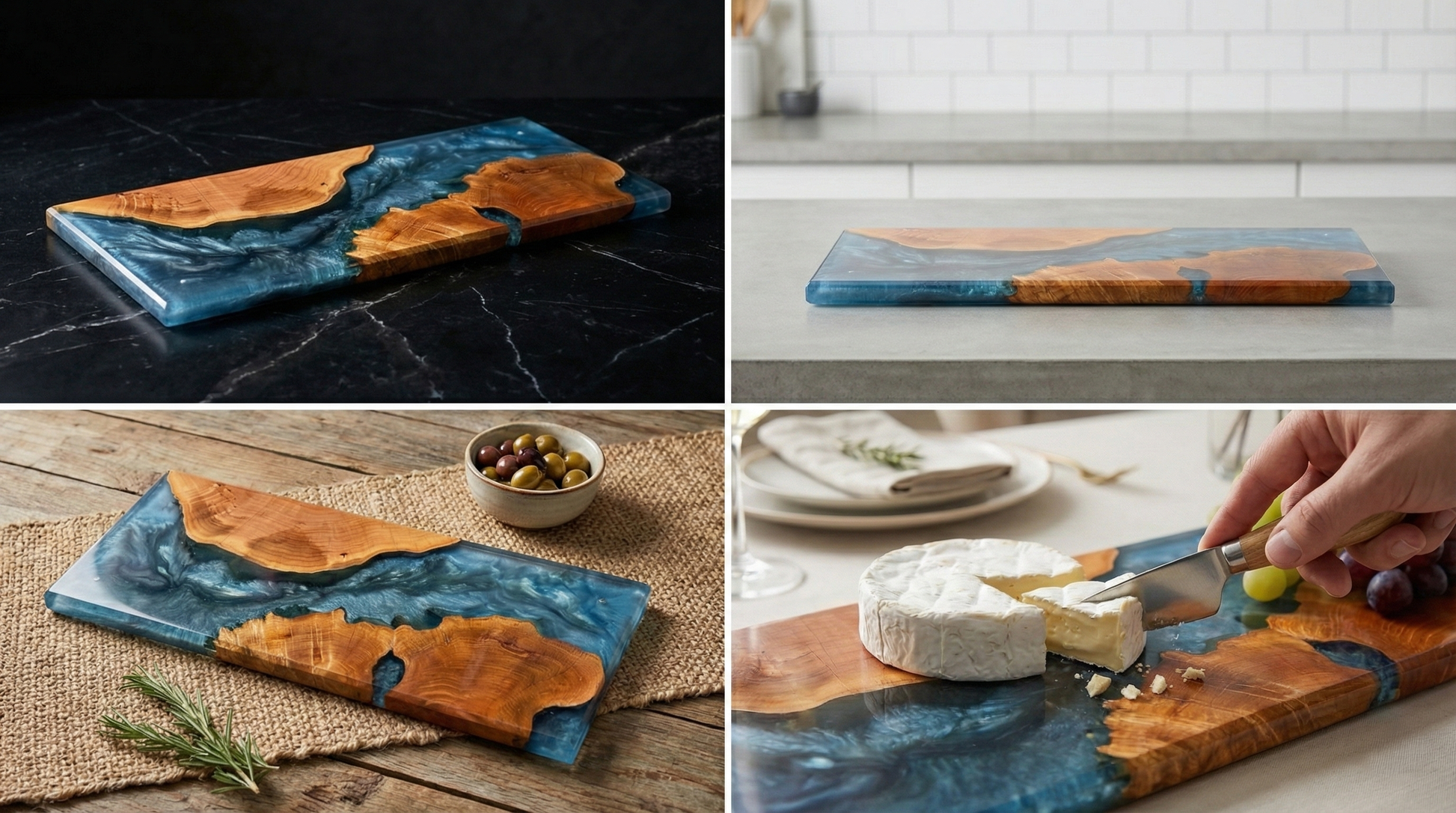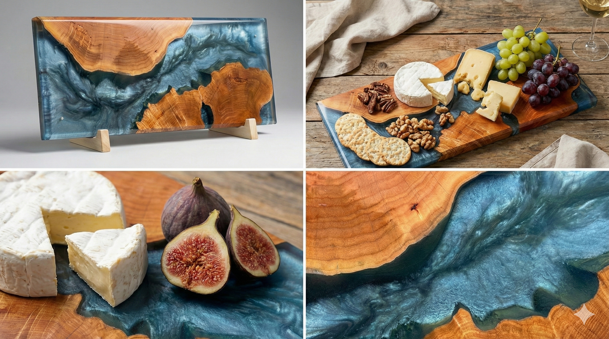 The cool, steely tones of the resin provide a dramatic contrast against the warm, fiery orange hues of the wood grain, making this the perfect stage for high-contrast appetizers like creamy brie, dark chocolates, or bright red grapes.